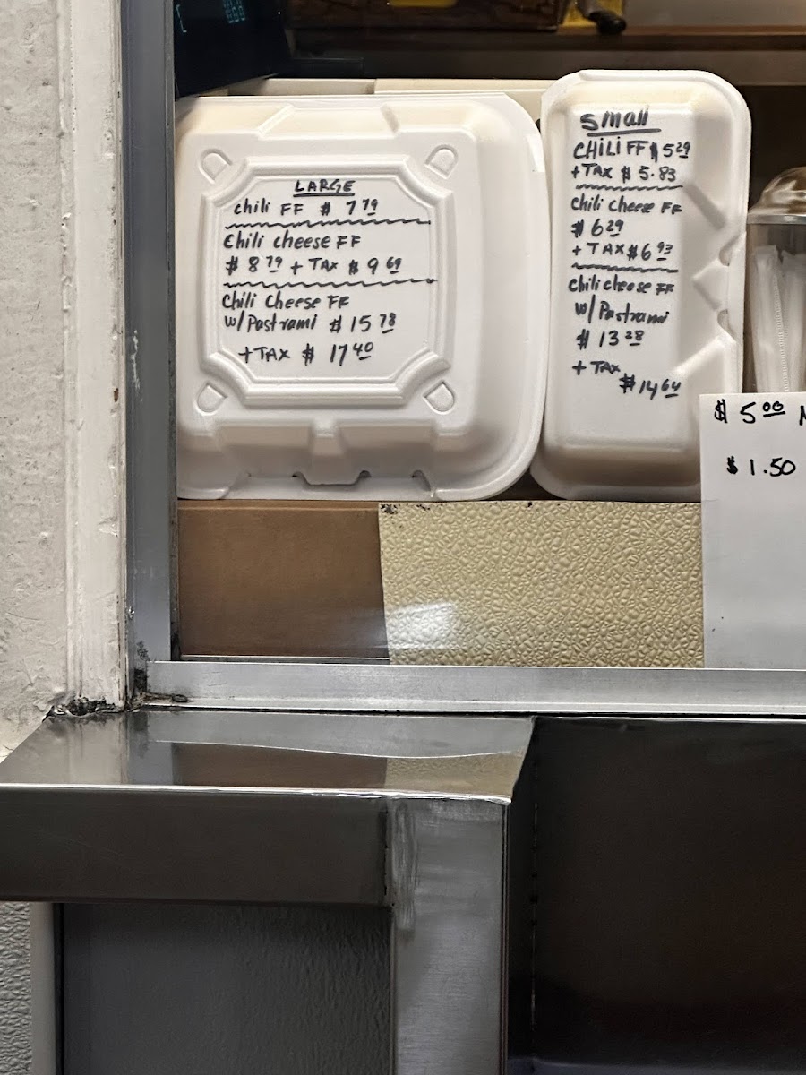 - Sides and Snacks: Features items like chili cheese fries, chili cheese pastrami fries, and onion rings, which can be ordered in small or regular sizes.